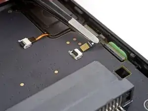 Используйте пинцет с притуплёнными концами, чтобы вытянуть разъём аккумулятора из его гнезда в правом нижнем углу устройства.
