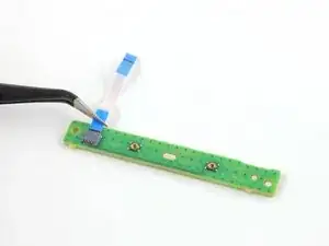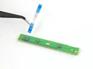 С помощью пинцета потяните за синюю тягучую ленту прямо от разъёма, чтобы отсоединить ленточный кабель кнопок питания и извлечения.