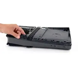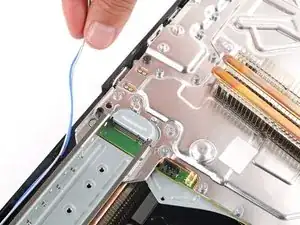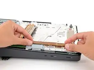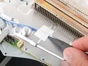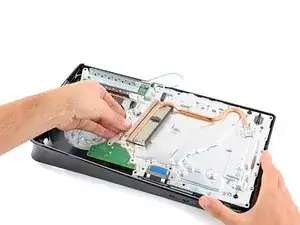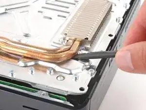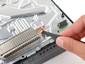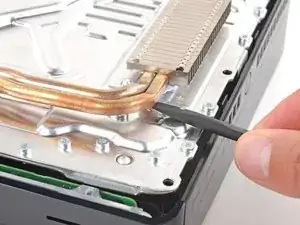 Термопаста скрепляет нижние ребра радиатора (ближайшие к кнопке питания) с металлическим экраном. В зависимости от возраста устройства и состояния термопасты, отделение радиатора может потребовать усилия.