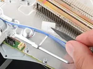Удерживая металлическую планку нажатой, захватите пластиковую тянущую вкладку пальцами или пинцетом и вытяните кабель прямо из гнезда.