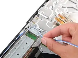 Используйте острый конец лопатки, чтобы отогнуть маленький кусочек белой ленты, закрепляющей кабели антенны на металлическом экране.