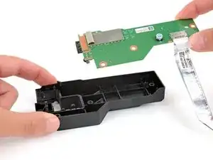 Используйте пальцы, чтобы сдвинуть кожух платы USB из-под металлической защёлки, удерживающей его в корпусе.