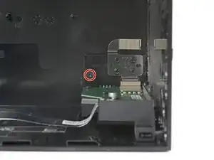 Удерживая металлическую защёлку нажатой, используйте пинцет, чтобы потянуть вверх за язычок и отсоединить кабель кнопки питания от центрального корпуса.