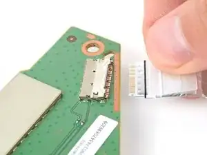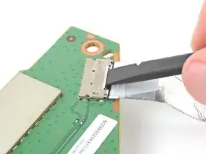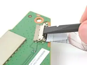 Используйте остроконечный конец лопатки, чтобы нажать на металлическую защёлку сбоку разъёма платы кабеля кнопки питания.