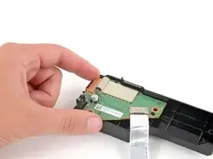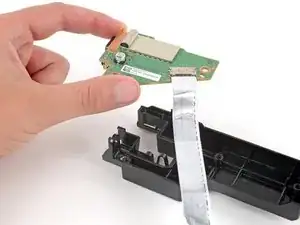 Держа металлическую защёлку нажатой, используйте пинцет, чтобы потянуть вверх за тяговую бирку и отсоединить кабель кнопки питания от центрального шасси.