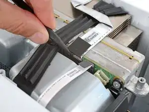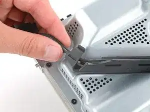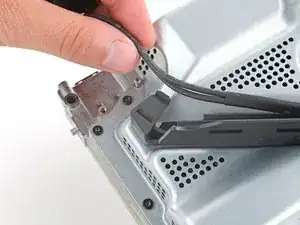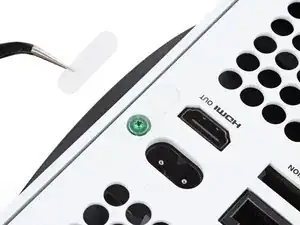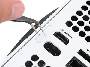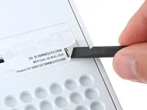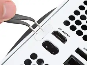 Используйте пару косых пинцетов, чтобы снять наклейку, скрывающую первый винт на задней панели, возле основания.
