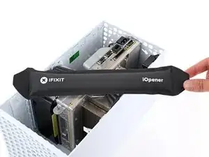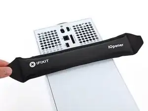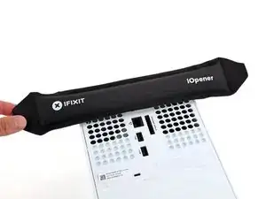 Нагрейте iOpener и приложите его к меньшей наклейке внизу задней панели на две минуты.