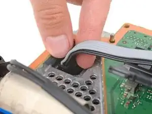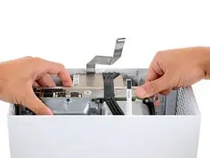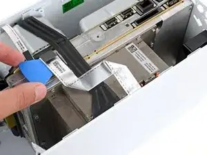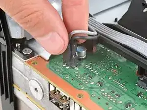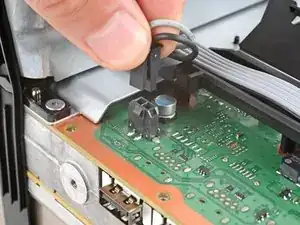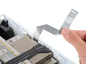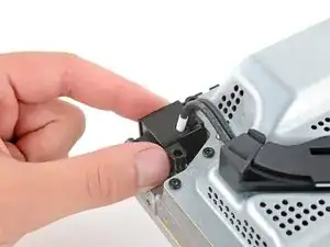 Удерживая металлический язычок нажатым, используйте пинцет, чтобы потянуть за оттяжку и отсоединить кабель кнопки питания от центрального шасси.