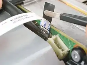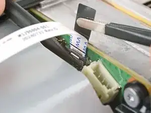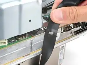 Используйте заострённый конец лопатки, чтобы нажать на металлический язычок на боковой стороне разъёма платы кабеля кнопки питания.