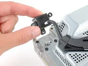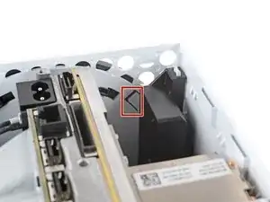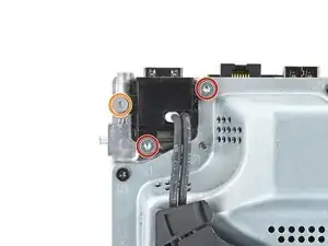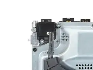 Используйте отвёртку Torx T8, чтобы отвинтить три винта, фиксирующие разъём питания к шасси: