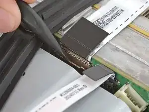 Используйте пинцет, чтобы аккуратно потянуть за чёрную пластмассовую оттяжку и отсоединить кабель USB‑порта.
