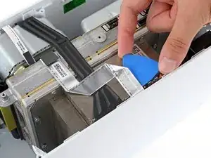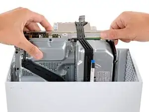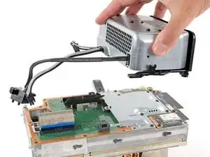 Отведите кабель блока питания в сторону и поднимите экран платы вертикально вверх, чтобы снять его.