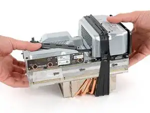 С помощью отвертки T8 Torx удалите три винта, крепящие вентилятор к центральной раме: