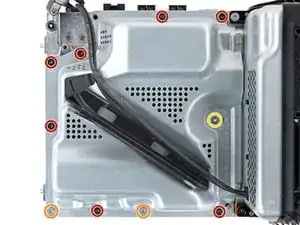 Используйте отвёртку Torx T8, чтобы отвинтить три зелёных винта длиной 7,4 мм, фиксирующих узел центрального шасси к корпусу.