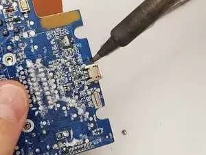 Удалите порт зарядки с края материнской платы, отсоединив его от каждой из четырёх точек пайки и подняв порт с платы.