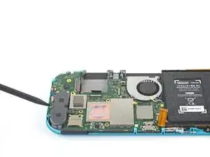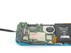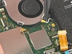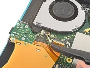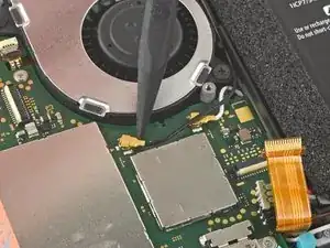 Используйте инструмент для открытия или ноготь, чтобы приподнять маленькую шарнирную фиксирующую планку на ZIF-коннекторе кабеля вентилятора.