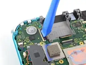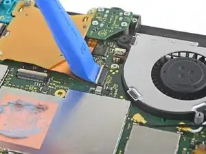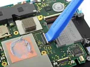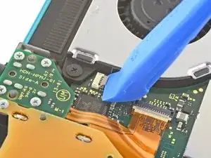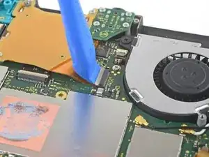 Используйте инструмент для вскрытия или ноготь, чтобы откинуть маленькую шарнирную защёлку ZIF-коннектора межплатного кабеля на материнской плате.