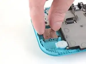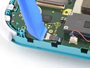 Используйте инструмент для открытия или ноготь, чтобы приподнять маленькую шарнирную фиксирующую планку на ZIF-коннекторе кабеля правого джойстика.