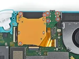 Используйте отвертку JIS 000 или официальную отвертку iFixit PH 000, чтобы выкрутить следующие шесть винтов, фиксирующих материнскую плату: