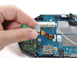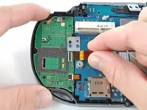 Освободите разъём гибкого кабеля правой кнопки-плеча, аккуратно поддев язычок лопаткой.