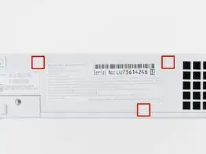 Используйте металлическую лопатку, чтобы удалить три выделенные заглушки винтов, приклеенные к боковой части Wii.