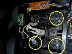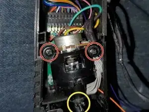 Этот металлический вал (обведён) постоянно становится причиной обрывов проводов. Logitech экономит на проводах... Устал постоянно паять их обратно, а заменённые провода были чуть толще и теперь не видно обрыв — поэтому заменяю всю проводку. (На этот раз причиной оказался не обрыв провода, а ослабленный контакт в разъёме, но ремонт всё равно был нужен.)