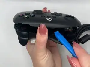 Вставьте инструмент для вскрытия в небольшой зазор между передней и задней панелями и аккуратно подденьте заднюю панель, чтобы освободить нижние защёлки верхней панели контроллера.