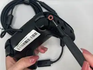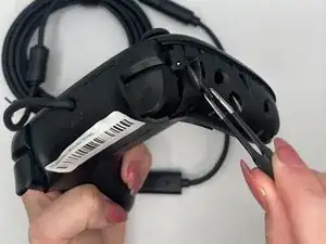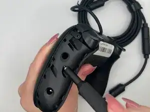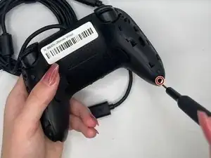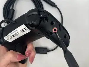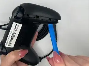 Вставьте инструмент для вскрытия в маленькое отверстие между передней и задней панелями и аккуратно подденьте заднюю панель, чтобы открыть нижние защёлки верхней панели контроллера.
