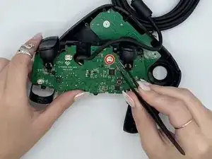 Пинцетом аккуратно отсоедините правую кнопку-бампер.