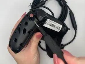 Вставьте инструмент для вскрытия в маленькое отверстие на задней части ручки и аккуратно подденьте крышку ручки, пока она не отщёлкнется.
