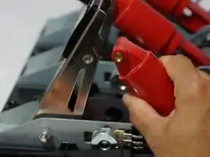 Одновременно снимите винты 10 мм, соединяющие педаль с красным поршнем позади неё.