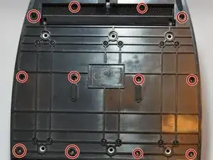 Переверните устройство. Снимите четырнадцать винтов 15,8 мм с нижней стороны корпуса педального блока крестовой отверткой #1.