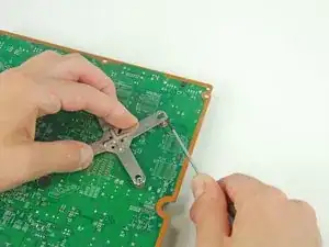 Если вы беспокоитесь о царапинах на плате, вставьте лопатку или тонкую отвертку через одно из отверстий в x-скобе, в зазор сразу у винтовой стойки. Подденьте наружу, чтобы освободить x-скобу. Повторите для противоположной стороны.