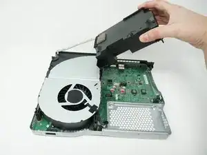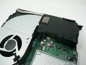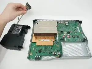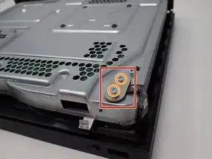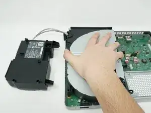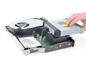 Дисковый привод удерживается на материнской плате только двумя кабельными разъёмами. Держите привод при перевороте консоли, чтобы не повредить его.