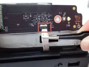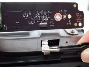 Потяните верхний край белой защёлки вниз, затем с помощью точных пинцетов извлеките белый разъём из отставшей панели.