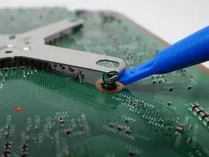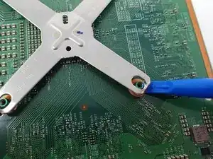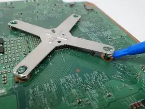 Используя пластиковый инструмент для вскрытия, подденьте углы X-образной металлической детали, чтобы они поочередно отсоединились от материнской платы.