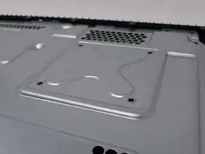 Используя отвертку Torx T10, снимите два винта, расположенные по обе стороны металлического корпуса. Один рядом с вентиляционной решёткой вентилятора, другой рядом с вентиляцией блока питания.