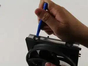 Когда радиатор/вентилятор сняты с платы, используйте пластиковый инструмент для открытия, чтобы поддеть пластиковый вентилятор от металлического радиатора у прямоугольных защёлок вентилятора.