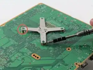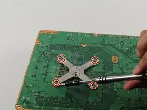 Переверните плату на другую сторону и найдите металлическую скобу в форме креста.