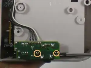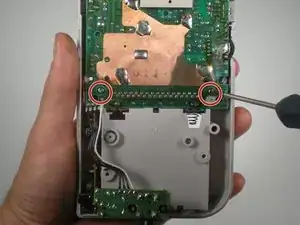 Снимите два винта, которыми плата крепится к корпусу, используя отвертку Phillips №00. Это даст доступ к точкам подключения разъёма для наушников.