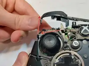 Снимите верхнюю панель кнопок с контроллера, аккуратно поднимая защёлки, прикреплённые к внутренностям.