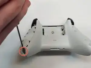 Удалите пять защитных винтов Torx TR9 длиной 9 мм с верхней и нижней частей областей рукояти контроллера, а также из центра отсека для батарей.