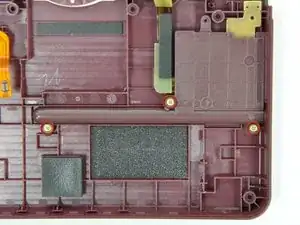 Удалите два золотистых винта с крестообразной головкой 4,0 мм, которые крепят узел правой кнопки-плеча к задней панели.