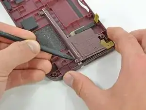 Отожмите разъём кнопки регулировки громкости/левой кнопки-плеча от её гнезда на материнской плате с помощью лопатки.