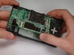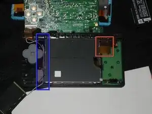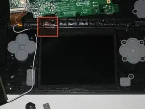 Нижний корпус всё ещё прикреплён к плате через кабель платы громкости и SD, выделенный красным. Не пытайтесь полностью снять нижний корпус DSi пока.