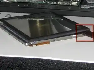 Положите рабочий сенсорный экран в рамку с задней стороны, ориентируя гибкий кабель как показано.