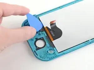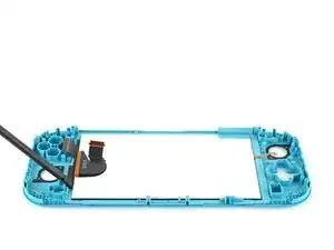 Используйте инструмент для вскрытия или ноготь, чтобы приподнять маленькую шарнирную защёлку ZIF-разъёма кабеля левого джойстика.