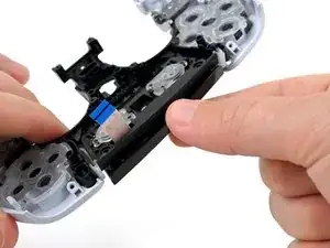 Кнопки L1 и R1 удерживаются двумя защёлками. Если отцепилась только одна защёлка, переместите лопатку на другую сторону кнопки, чтобы отсоединить оставшуюся защёлку. Не продолжайте поддевать одну сторону после отцепления защёлки — это может привести к поломке другой защёлки.