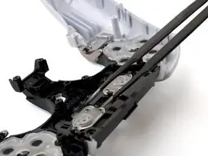 Используйте пинцет, чтобы извлечь ленточный кабель задней кнопки RB из пластикового зажима.