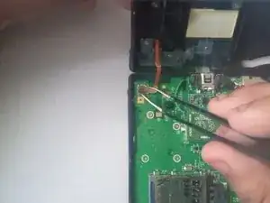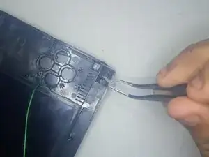 Пальцами отсоедините зелёную прямоугольную плату (сетевая плата) от маленького зелёного кабеля.